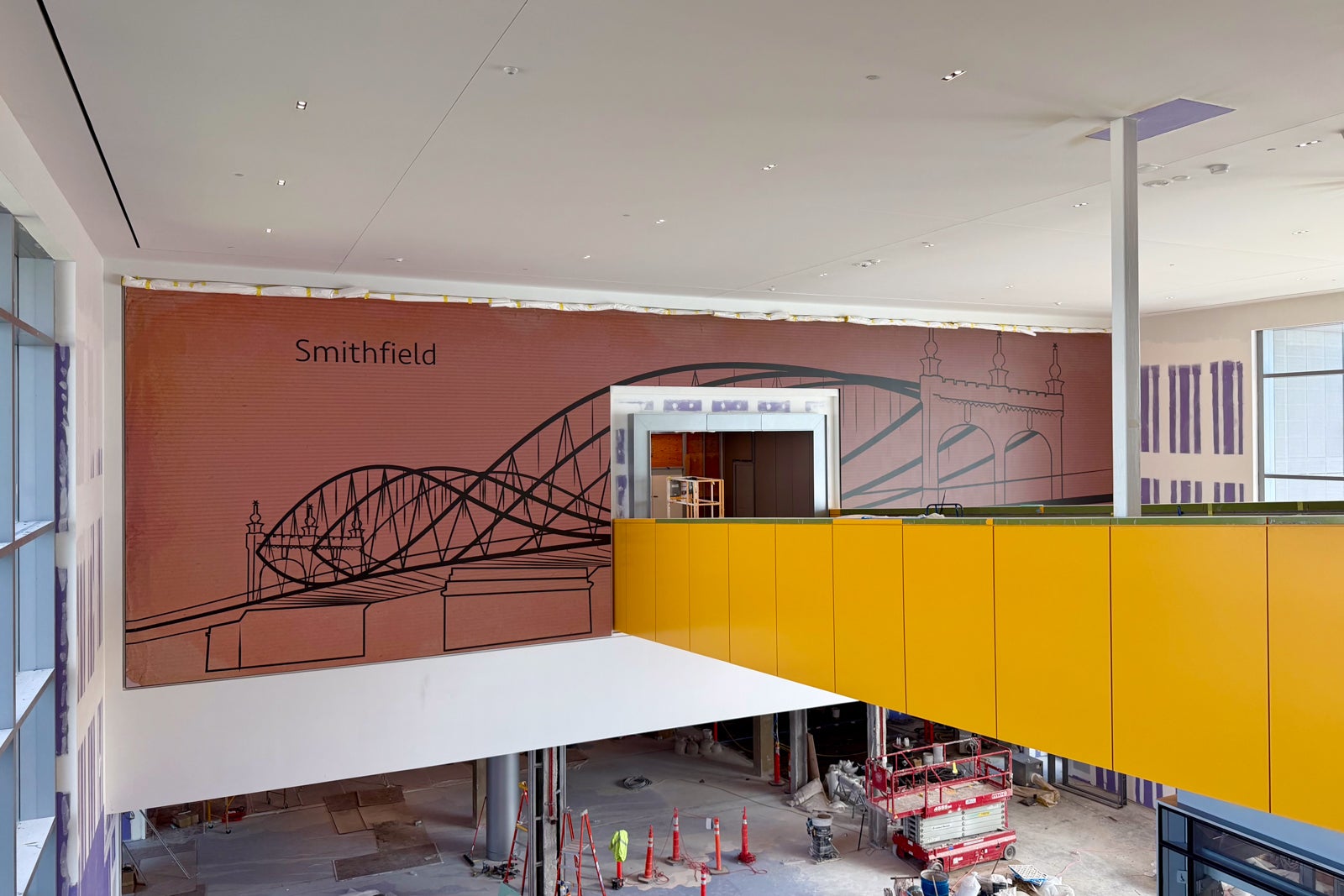 After security, passengers will walk over a short bridge decked out with a massive digital screen showing rotating silhouettes of Pittsburgh’s far more famous bridges, and then into one small tunnel before being deposited into the central terminal core.