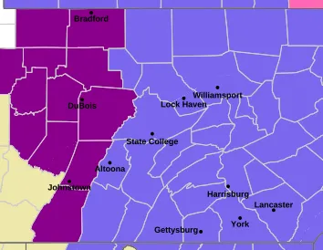 “Significant icing” along with “Additional sleet accumulations up to a coating and ice accumulations between one tenth and one quarter of an inch,” are possible in the cities of DuBois, Somerset, Warren, St. Marys, Bradford, Clearfield, Johnstown, Ridgway, Tionesta, Franklin, Punxsutawney, Oil City, Ford City, Brookville, Indiana, Armagh, Kittanning, and Clarion, the NWS says.