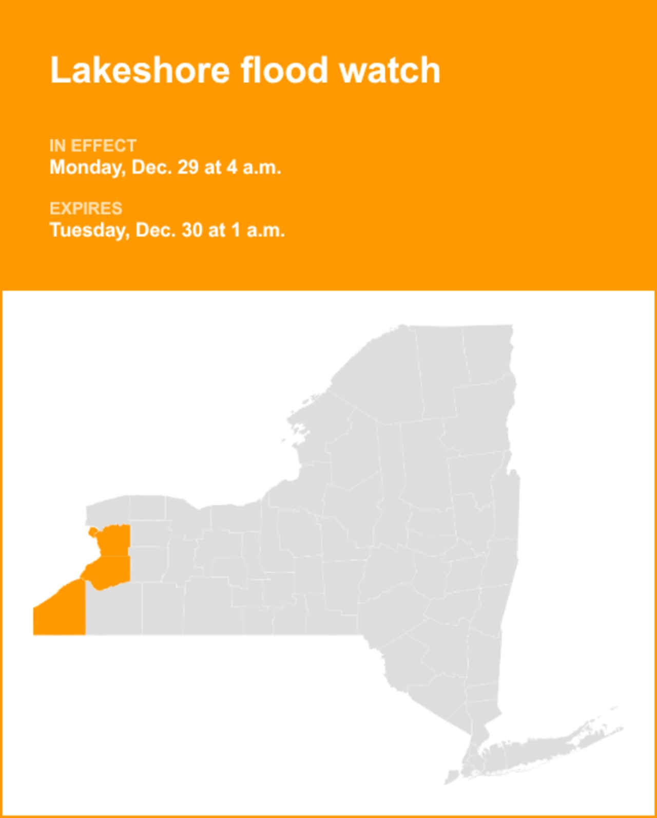 On Saturday at 12:54 p.m. the National Weather Service released a lakeshore flood watch valid from Monday 4 a.m. until Tuesday 1 a.m. for Erie and Chautauqua counties.