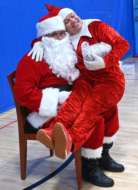Santa looks a little confused as his number one elf decided to jump on his lap at the YMCA.