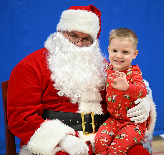 Santa’s number one Elf gives a Greater Pittston YMCA preschooler, two-year-old Harley Prawdzik, a high five during the annual Christmas toy giveaway.