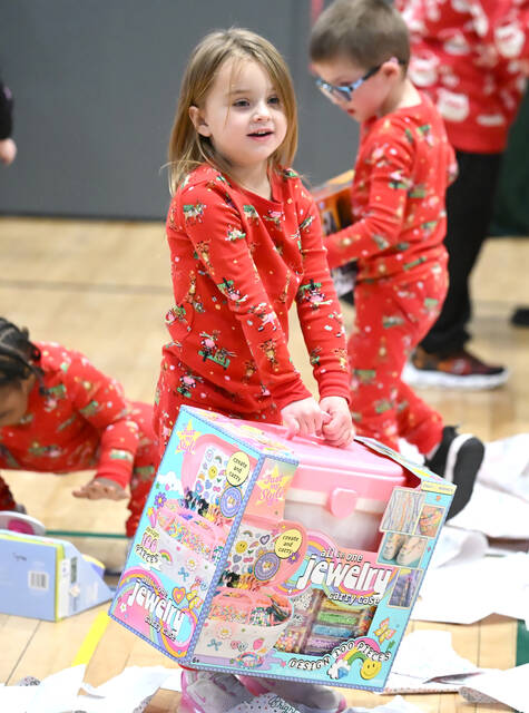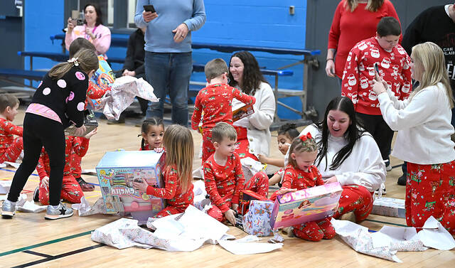 Each Pittston YMCA preschooler received a gift from Santa Claus courtesy of the Greater Pittston Santa Squad. Here, all of the children opened their gifts at the same time.
