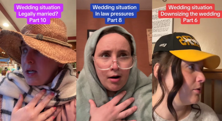 Cassie Horrell plays three different characters in her @weddingprocass Instagram Reels Credit: Screenshots: Instagram @weddingprocass