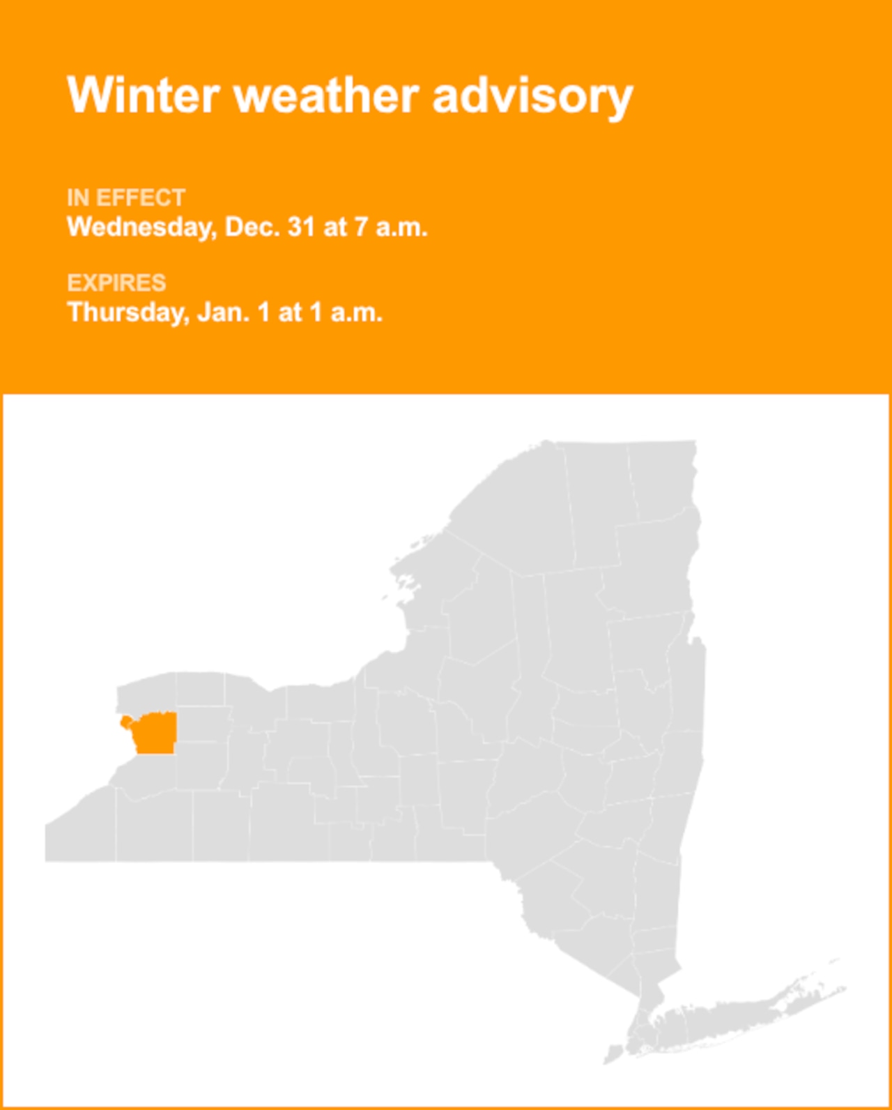 At 1:16 p.m. on Tuesday, the National Weather Service issued a winter weather advisory valid from Wednesday 7 a.m. until Thursday 1 a.m. for Erie County.