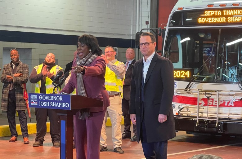 Philadelphia Mayor Cherelle Parker, at podium, and Pennsylvania Gov. Josh Shapiro spoke at the Frankford Transportation Center after he announced new funding for SEPTA. Nov. 22, 2024. (Meir Rinde/Billy Penn)