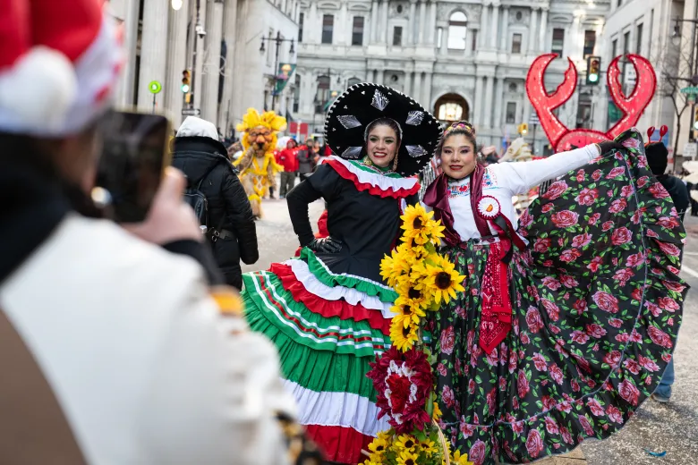 Members of the Danza Tonantzin group dance along the parade route during the Mummers Parade in Philadelphia on Thursday, Jan. 1, 2026. (Photo courtesy of Erin Blewett)