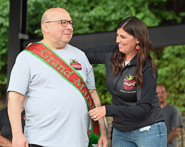 In August, Pittston Tomato Festival committee woman Sarah Donahue Cianfichi places the sash over the 2025 Grand Marshal Ben Tielle.