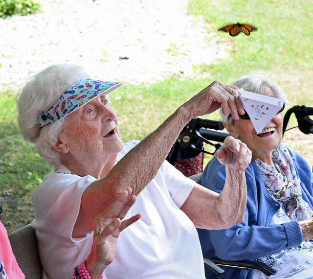 Wesley Village Myers Manor resident Joan Pribula watches the monarch butterfly leave the envelope it was occupying during the butterfly release at the campus in August.