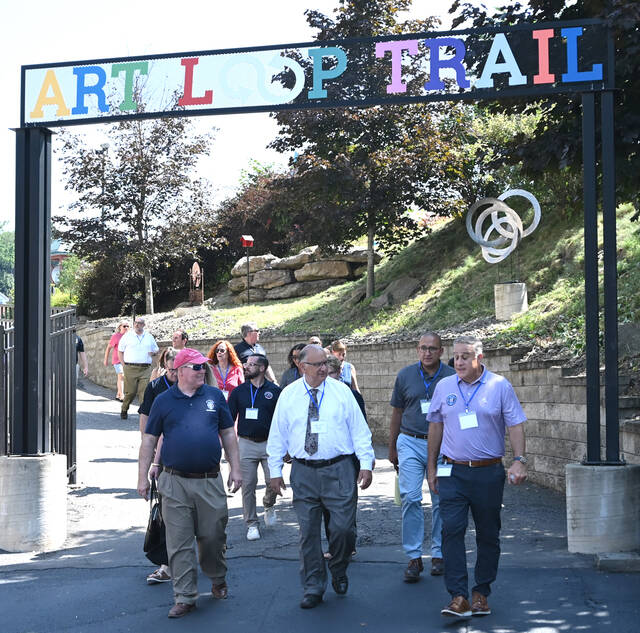 In August, City of Pittston’s Mayor Michael Lombardo led a walking tour for members of the City of Easton’s administration through the Art Loop Trail. Front row, left to right: David Allen Hines, Pittston CFO, Easton Mayor Sal Panto, Mayor Lombardo.