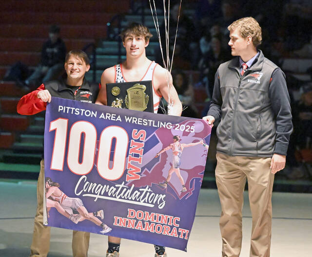 In January, Pittston Area senior Dominic Innamorati reached a milestone by taking his 100th career win. Celebrating with Innamorati is Head Coach Dave Krantz, left, and Assistant Coach Jared Fluginiti.