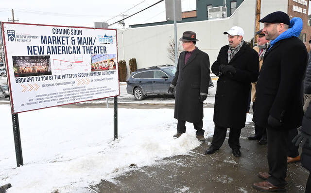 Pennsylvania Department of Community & Economic Development Sec. Rick Siger, far right, during his visit in January, as he glances at the sign for the City of Pittston’s future $40 million seven-story high rise/American Theatre slated to be tentatively completed by 2027.