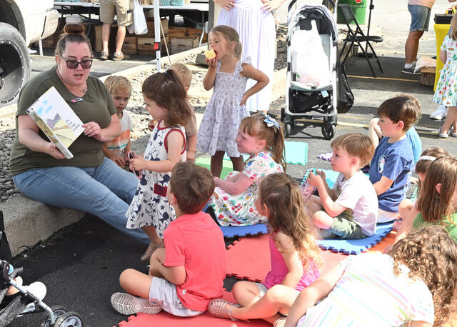In July, Pittston Memorial Library Youth Services Coordinator Morgan Salsman, left, reads to children at Kid’s Day at the Pittston Farmer’s Market.