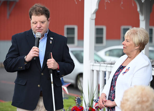 In June, remarks were offered by Purple Heart recipient U.S. Army Capt. TJ Hromisin-Ret. Standing next to Hromisin is Lynda Hoban, Hughestown Neighborhood Crime Watch president.