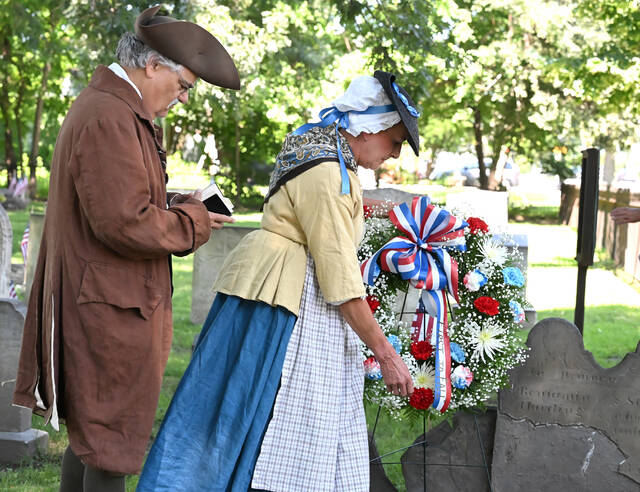 In late June, Sherry Emershaw, portraying Amy Harding, and Mark Kahn, portraying Rev. Joshua Entwhistle, as they play a wreath at the grave of Benjamin and Stukley Harding, who was killed by the Indians on June, 30, 1778.