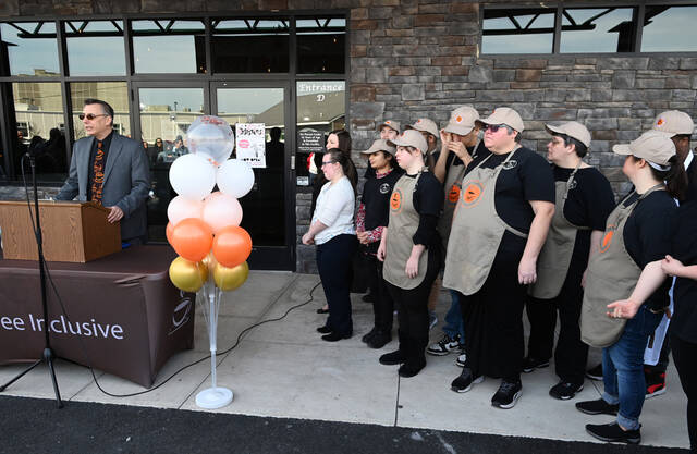 In March, Frank Bartoli, PA Inclusive president & CEO, spoke at the ribbon-cutting ceremony of the new venture, The Bakery at Coffee Inclusive, with his team of bakery workers to his left.
