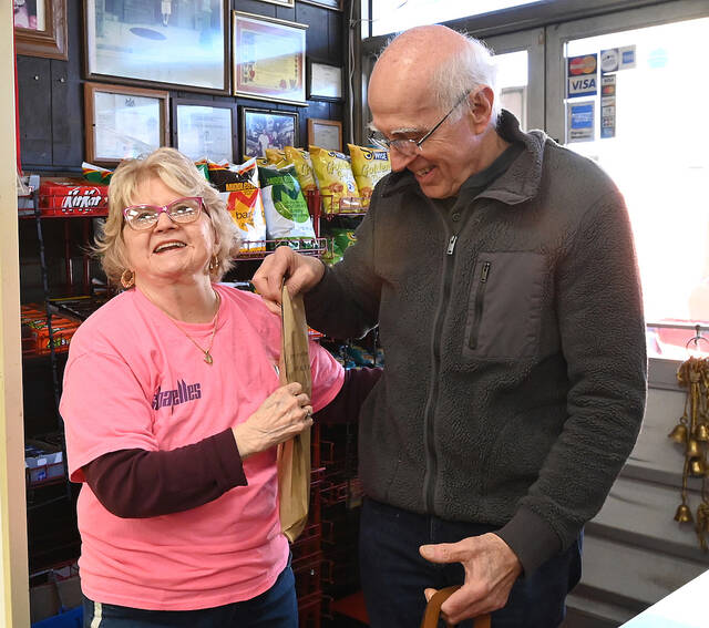 In March, Art Valli, long time friend and customer of Sabatelle’s Market, came bearing gifts for Jane Sabatelle on Monday when the market reopened after taking on smoke and water damage from the fire next door on December 23, 2024.