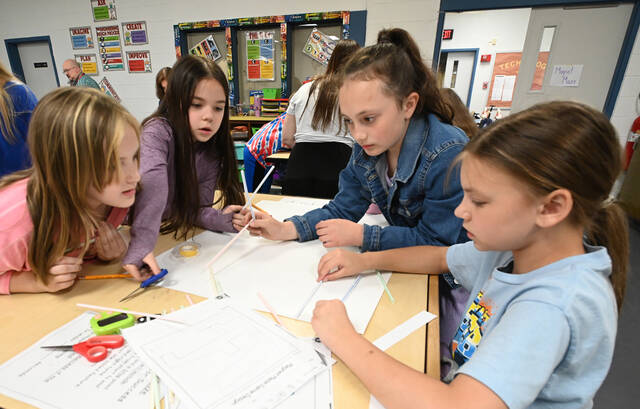 This foursome of Pittston Area third grade students formulate on how to create a magnet maze in May. Left to right: Savannah Slayton, Emma Ward, Lucy Sciandra, Reagan Nemic.