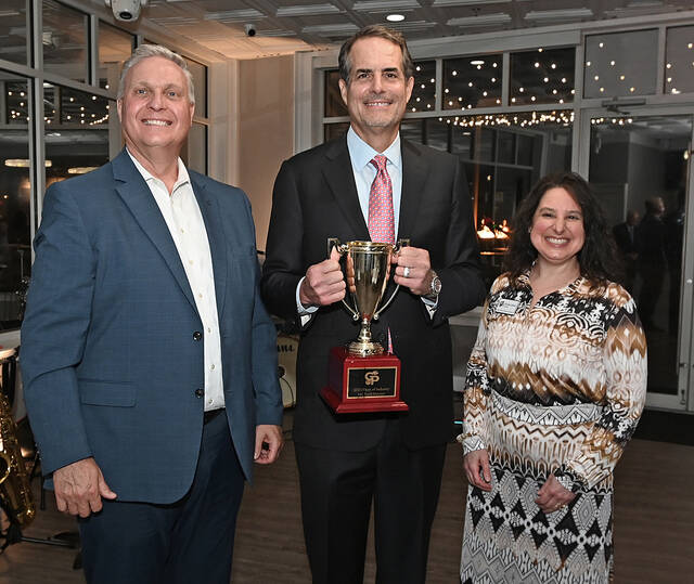 In May, John Serafin, Greater Pittston Chamber of Commerce board chair, left, along with Chamber President Michelle Mikitish bookend Scott Meuser, the 2025 Titan of Industry Award recipient given by the Chamber.