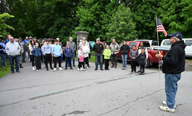 In May, Ron Gitkos, right, organizer of the U.S. Flag replacement program at the West Pittston Cemetery, member of the 1st Lt. Jeffrey DePrimo American Legion, West Pittston, gives last minute instructions before the over 60 volunteers completed the tasked of removing old flags and replaced them with new ones before Memorial Day.