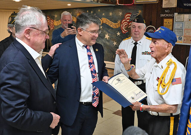 Ninety-nine-year-old Sam Guarnieri, right, a veteran of WWII, accepts a citation from the PA House of Representatives given to him by State Rep. Jim Haddock during the annual Dupont VFW Post 4909 Veterans Day ceremony in November. Left to right: retired Lackawanna Co. Judge Tom Munley, a Vietnam veteran; Haddock, John Pliska, rear right; Guarnieri.