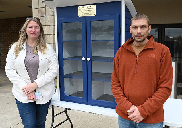 Michelle Rusnock, left, and Derrick Klinefelter, right, of Garage on Broad, Pittston, built and donated the Wyoming Area Catholic Blessing Box, shown in the photo, in October. The box will be placed in front of the school located at 1690 Wyoming Ave., Exeter, for people to donate nonperishable food as well as take food if needed. The project is spearheaded by the school’s Builder’s Club.