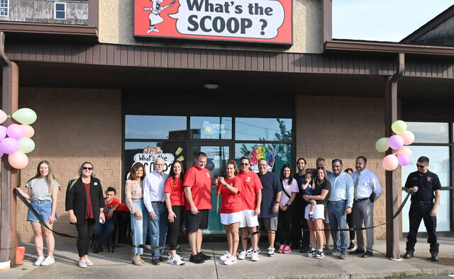 In September, JFL What’s the Scoop held a ribbon-cutting ceremony on Tuesday at JFL Plaza next to the Pittston Memorial Library. Principal owners in red t-shirts, center are, left to right: Jennifer Lombardo, Robbie Lombardo, Michelle Lombardo Albolino, Marc Albolino.