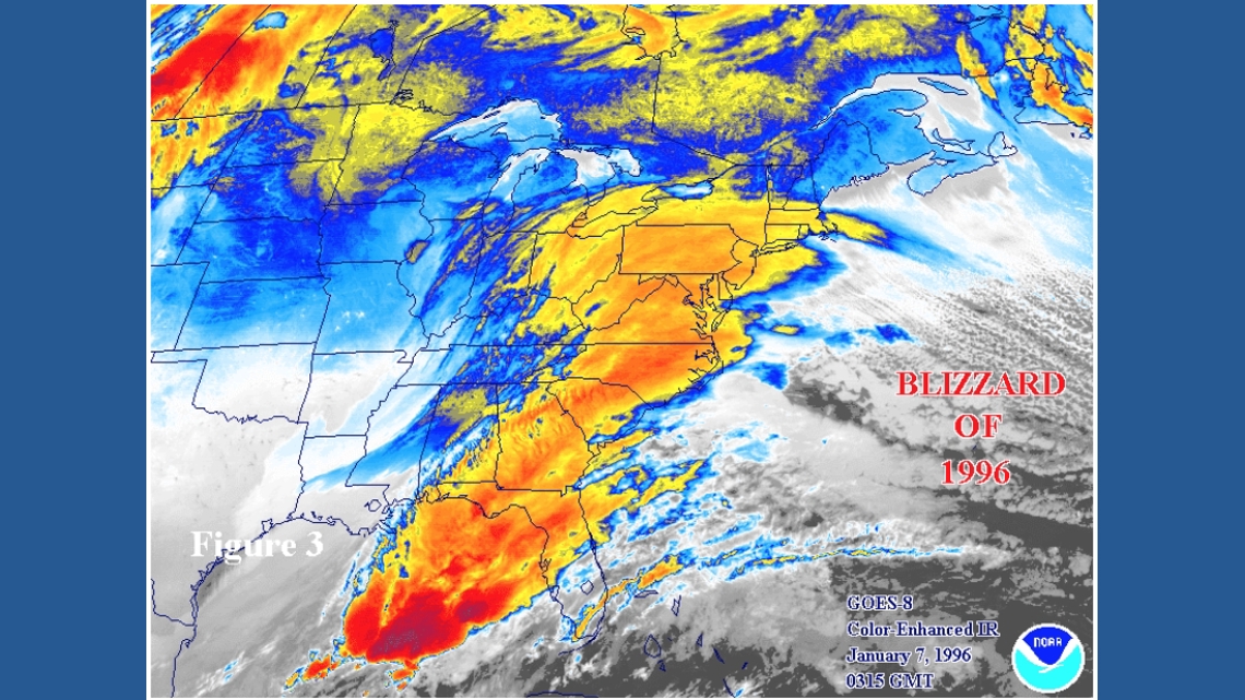 SCRANTON, Pa. — It is known as the North American Blizzard of 1996, a major nor’easter that formed on the morning of January sixth in the Gulf. Later that afternoon, it started snowing in the DC area, and by the next day, this is what the massive storm looked like on infrared satellite imagery.