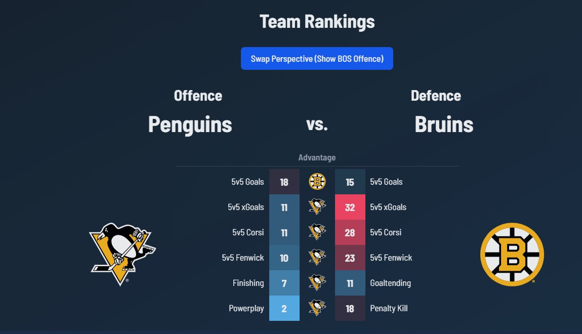 The Penguins and Bruins are similar in that both have good power plays, they both finish well, their offensive 5v5 process is strong, their goaltending and penalty kills are similar.