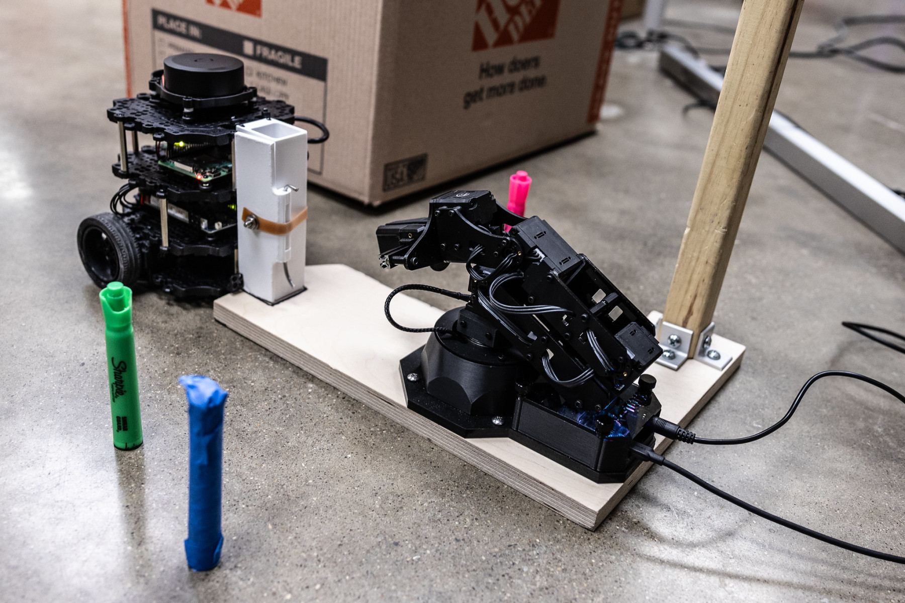 All semester, the teams worked toward their final project. They programmed the pinchers to retrieve a highlighter pen and place it in a storage bin connected to the burger. The burger would then maneuver through the maze and drop the pen at the other end.