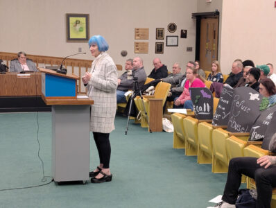 Parkersburg resident Kim van Rijn speaks during the public forum of Tuesday’s Parkersburg City Council meeting as signs opposing a proposed contract for trash service with Waste Management rest on seats behind her. (Photo by Evan Bevins)
