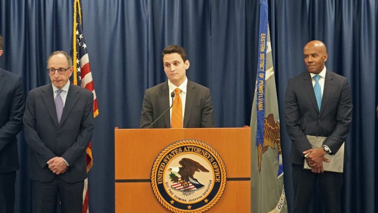 David Metcalf, United States Attorney for the Eastern District of Pennsylvania (center), speaks during a press conference outlining an indictment for a men’r basketball points-shaving scheme. (Nick Kariuki/Billy Penn)