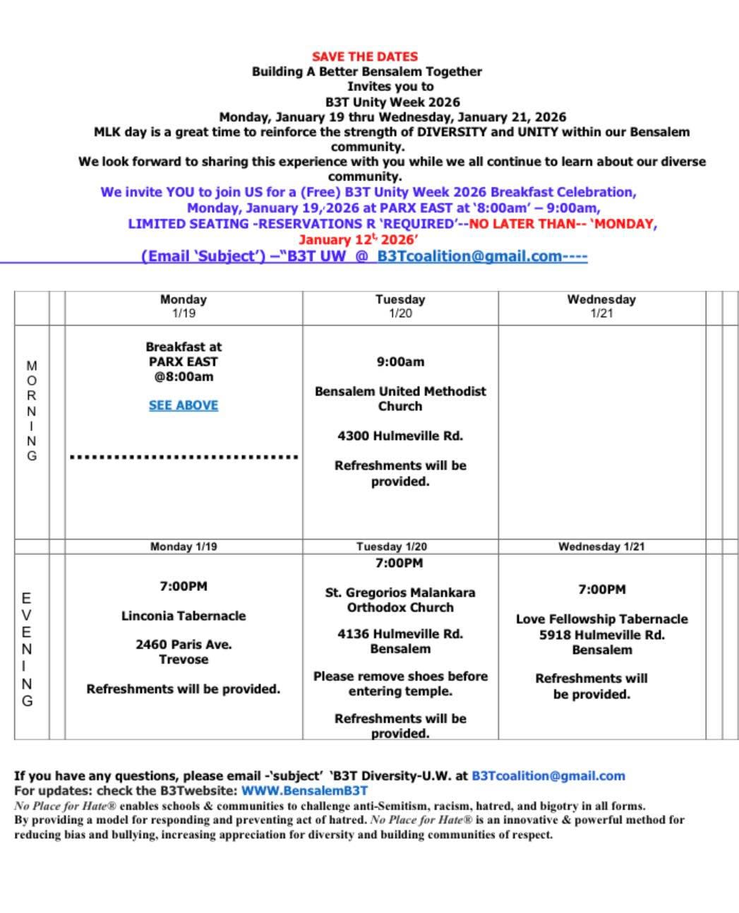 Building a Better Bensalem Together has rolled out the schedule for Unity Week, which will only be events scheduled over three days this year. See the schedule below