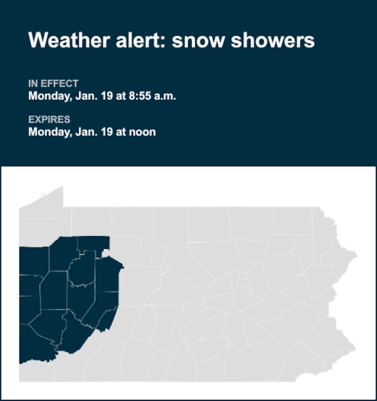 The National Weather Service issued a weather alert at 8:55 a.m. on Monday for snow showers until noon for Higher Elevations of Indiana as well as Mercer, Venango, Forest, Lawrence, Butler, Clarion, Jefferson, Beaver, Allegheny, Armstrong, Washington, Westmoreland and Indiana counties.