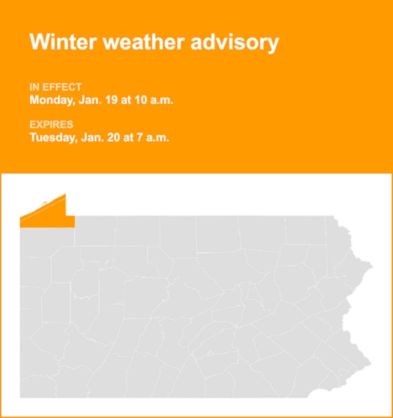 The National Weather Service released an updated winter weather advisory at 2:33 a.m. on Monday valid from 10 a.m. until Tuesday 7 a.m. for Northern Erie and Southern Erie.