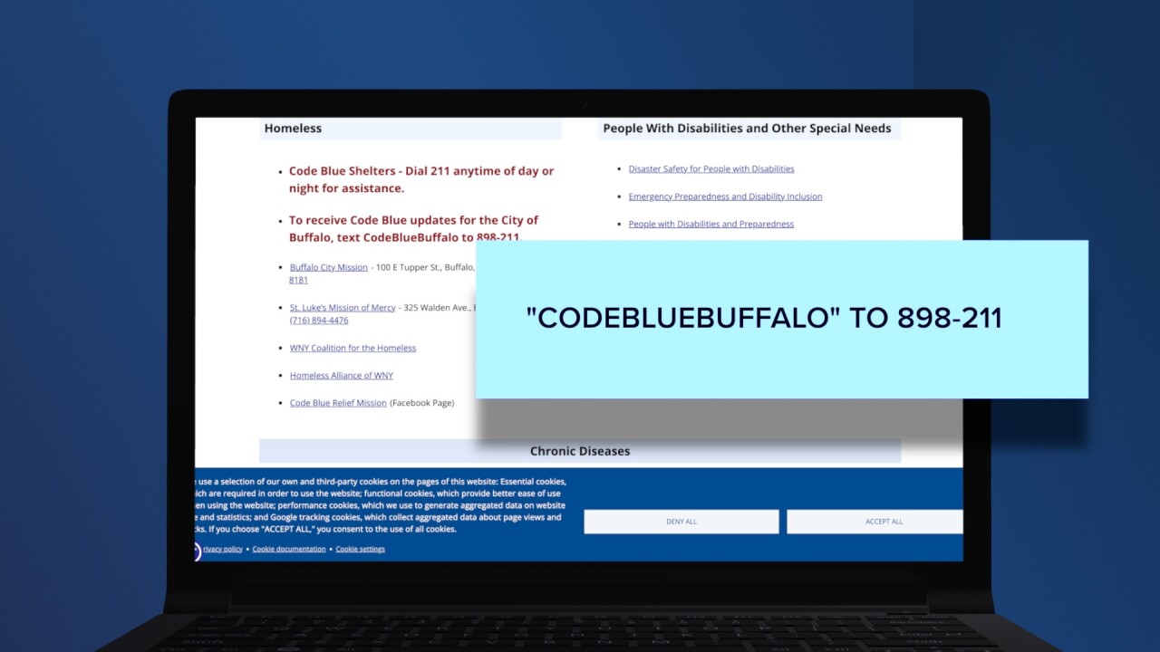 Chimera said all shelters across Erie County are open and available to residents in need. A full list can be found on the Erie County government website. Residents can also call 2-1-1 for shelter information or Code Blue updates. For City of Buffalo Code Blue alerts, residents can text CODEBLUEBUFFALO as one word to 898-211.