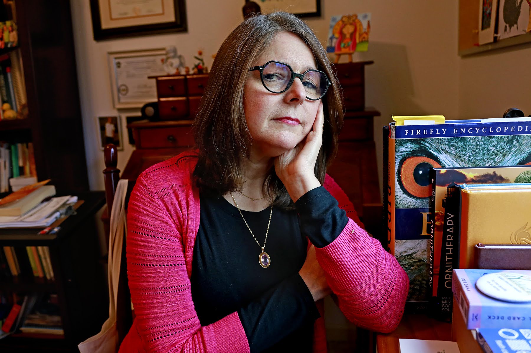 Alicia Sewald-Cisneros sits for a portrait in her office on Jan. 11, in her home in Wexford. Sewald-Cisneros immigrated from Venezuela as a young woman but remains connected to the Venezuelan community through friends who still live there. (Photo by Sophia Lucente for Pittsburgh’s Public Source)