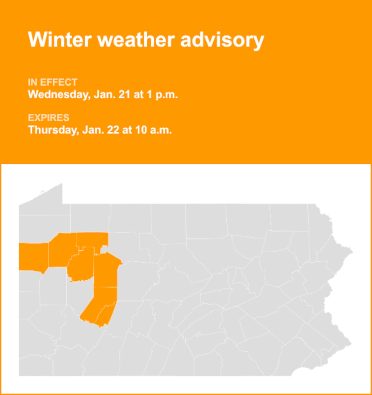 The National Weather Service released a winter weather advisory at 1:33 p.m. on Tuesday valid from Wednesday 1 p.m. until Thursday 10 a.m. for Higher Elevations of Indiana as well as Mercer, Venango, Forest, Clarion, Jefferson and Indiana counties.