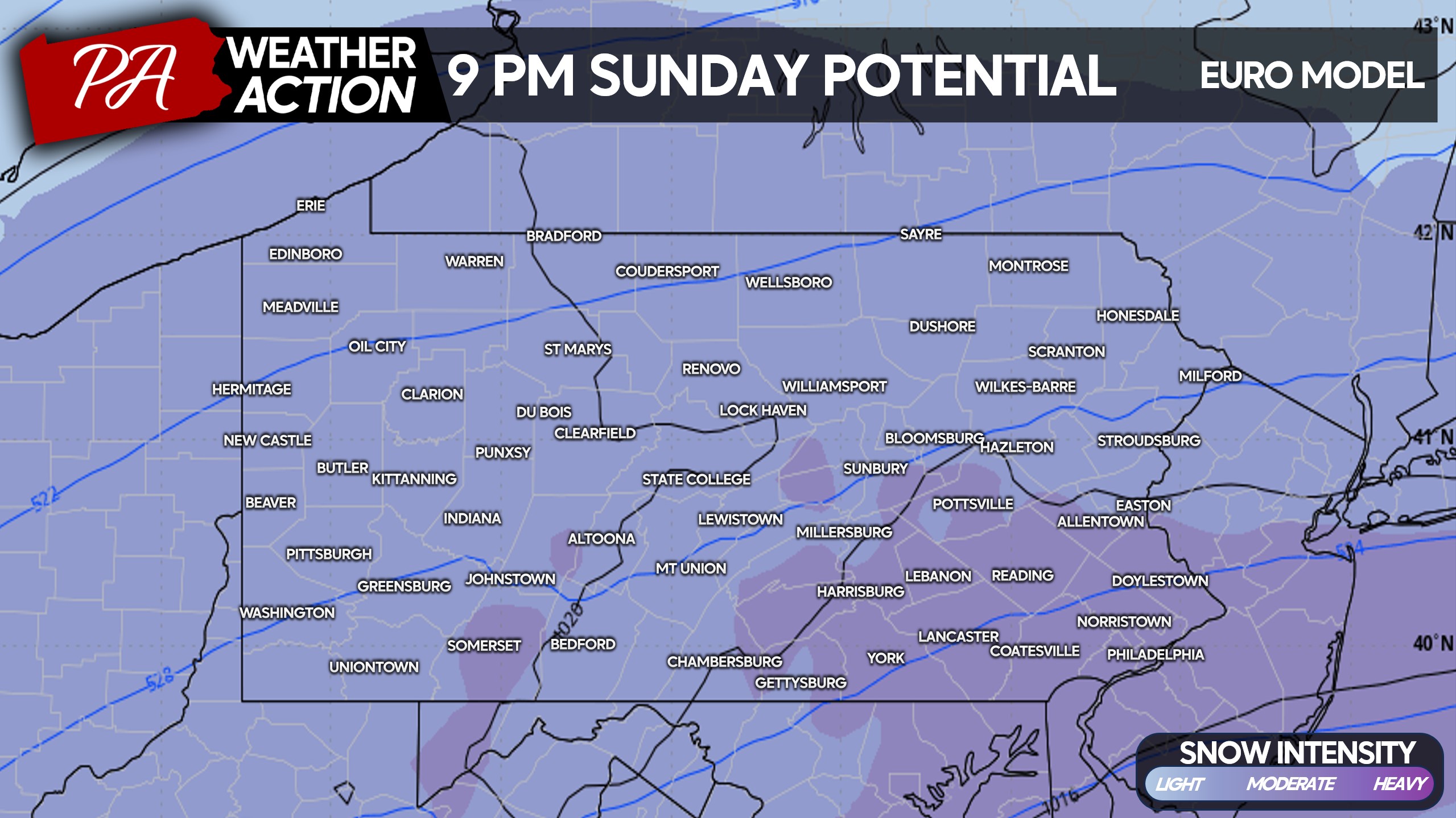 While difficult to lock in timing this far in advance, we are looking at snow moving into Southern PA Sunday morning, overspread most of the state south of I-80 by early Sunday afternoon. Below is the European model for around 2 PM Sunday.