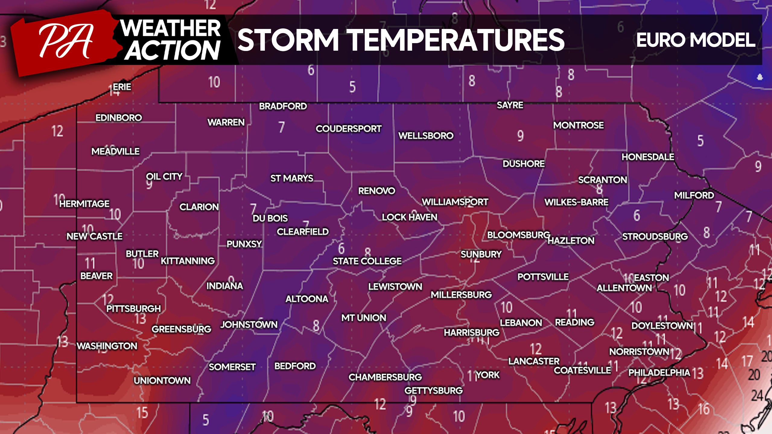 It has seemingly been impossible to not involve sleet or freezing rain in a major storm for us here in PA as of late, which has managed to derail what otherwise could’ve been memorable snowstorms. What will make this storm different is the temperatures not only at the surface but in the upper levels as well. As snow is falling, temperatures will range from 5-15° across the state.