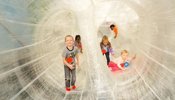 Kids explore crazy tunnels made from miles and miles of tape in “TapeScape 3.0” at the Children’s Museum. Photo by Renee Rosensteel.