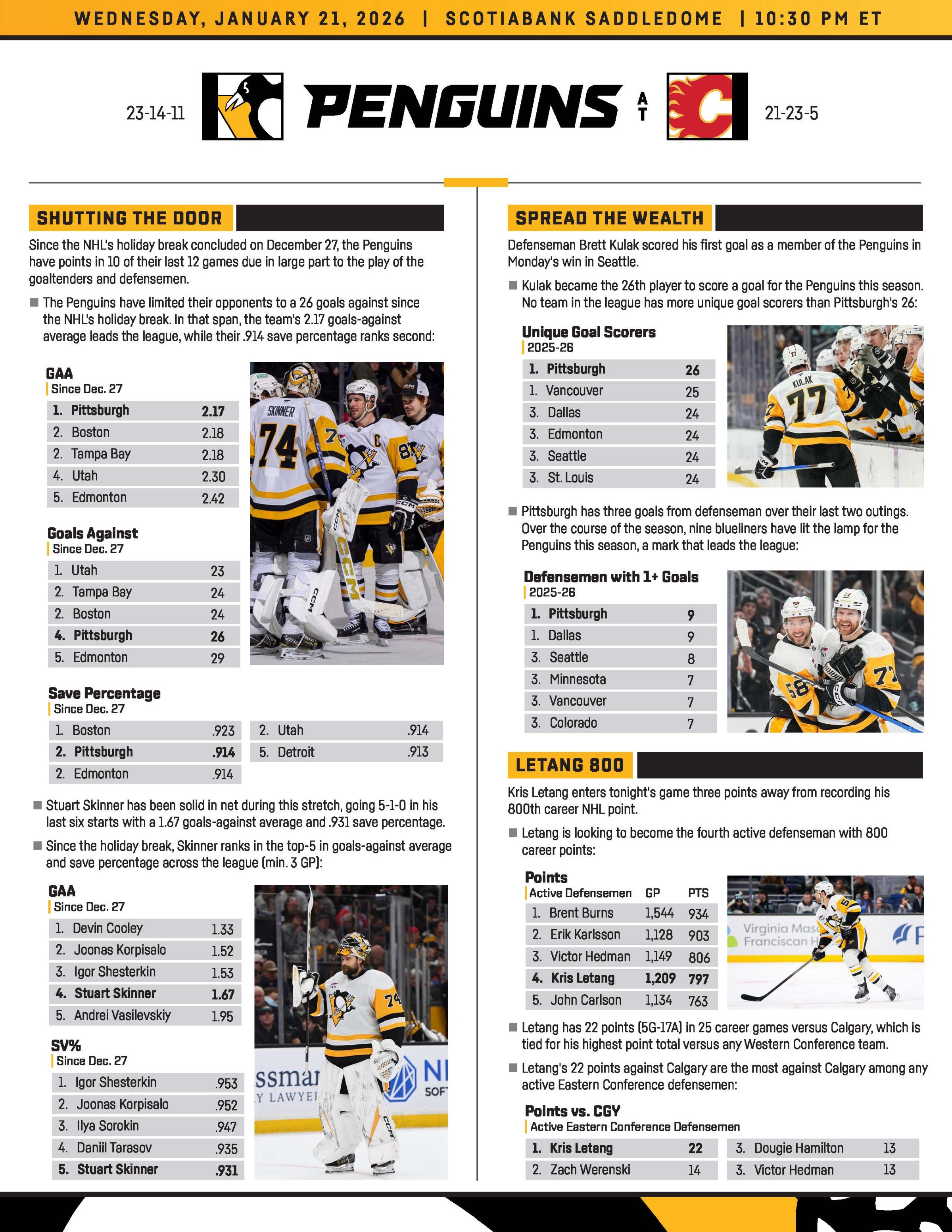 The biggest change to the lines from the last recent PIT/CGY game is the trade departure of key defenseman Rasmus Andersson and the addition of Whitecloud from that transaction. It’s a big loss to the current squad – Anderssen had 10 goals and 30 points this season for the Flames, ranking third on the team in both categories.The 21-year old Brzustewicz has replaced Anderssen on the top power play. Despite only having one career NHL point in 16 games, he has an offensive profile with a 92 point season in the OHL in 2023-24 and 44 points in the AHL since the start of the 2024-25 season.Coleman, who was on IR back for the Jan 10th game, has dropped his no contact jersey in practice and may be nearing a return.Perhaps luckily for Chinakhov, Brayden Pachal has been a scratch lately.Wolf has been Calgary’s primary goalie, but lately there’s been more of an even split due to Cooley playing really well lately (including, as mentioned, in Calgary’s recent win over the Pens). The two Flames goalies have each played three out of the last six games, Cooley did play their last game. He picked up the loss in OT, but stopped 29/31 shots to get there. Given how well he did against Pittsburgh in the recent past, it’ll be interesting to see if the Flames go back to Cooley for this game or turn the net back over to their usual starter in Wolf, who is only 1-5-0 with a .891 save% and 3.71 GAA in the calendar year of 2026 (compared to Cooley’s 2-0-1 record, .951 save% and 1.33 GAA stat line).The size and ruggedness of the Flames really stood out in their last game against the Pens. Klapka at 6’8” and 235 pounds is a menace and was getting under the skin of several Penguin players. Klapka’s 172 hits this season ranks 4th in the entire NHL, he’s going to throw the body on the forecheck on every available opportunity. Kevin Bahl at 6’6”, 230 has been a force averaging over 21 minutes per game this season, and has four assists in his last six games. Yan Kuznetsov presents another big body on the blueline, Pachal laid one of the biggest hits of the season last game. Mackenzie Weegar isn’t a huge frame, but a stout one with 117 hits this season. That game had a lot of tempers raised with post-whistle scrums and physicality throughout, surely that fresh memory will be at the top of everyone’s minds for tonight.Generating offense has been a real struggle for the Flames. Their 2.55 goals/game mark is only 29th in the NHL, their power play at 14.9% is a dreadful 31st. It’s not for a lack of trying (28.9 shots/game ranks 12th) but the lack of skill and overall ability has hindered them in a major way.