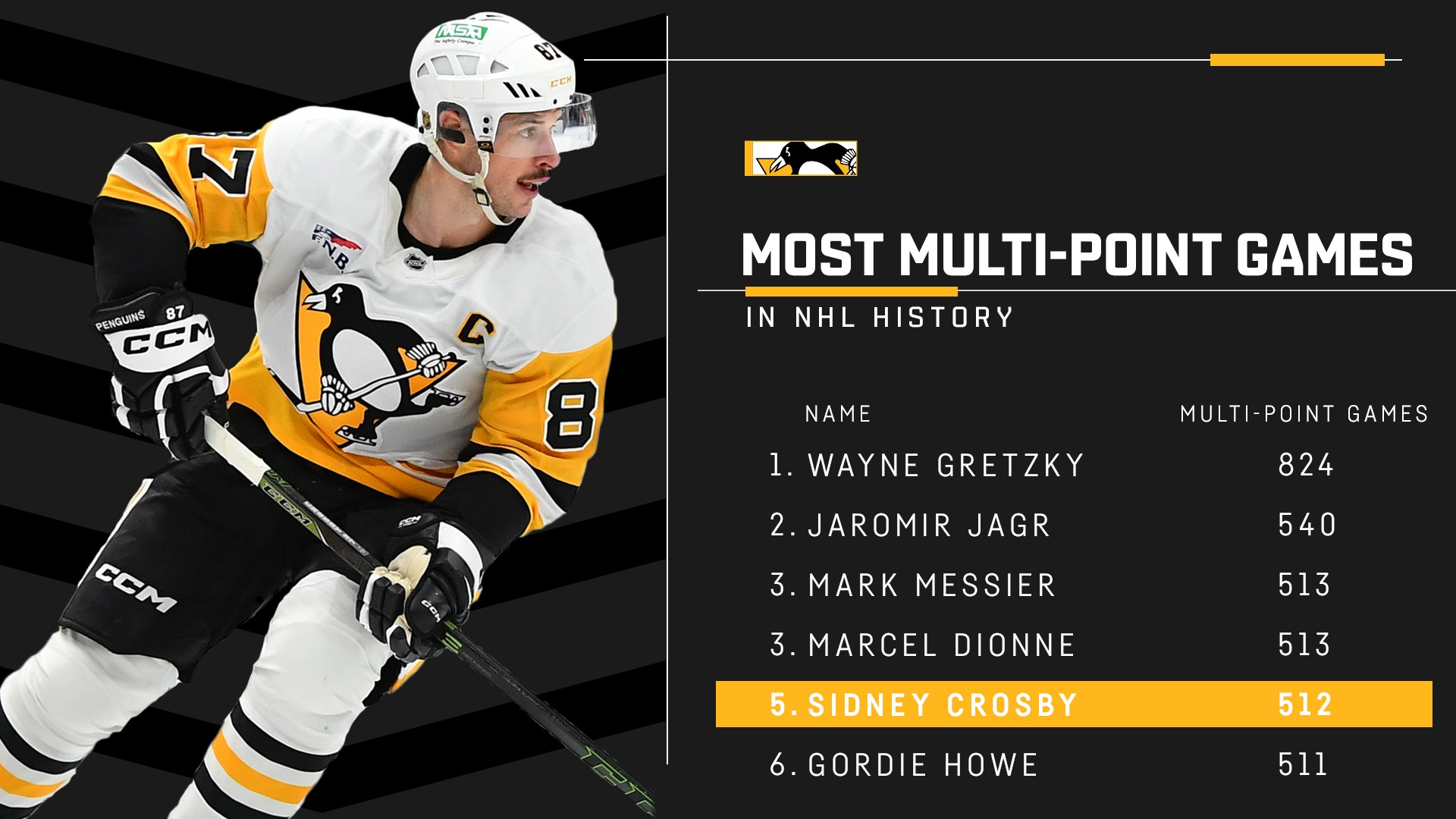 Sidney Crosby is riding a streak of three-straight games with multiple points. Last game pushed him past Gordie Howe, the next one will tie Mark Messier and Marcel Dionne. Seemingly every game Crosby is approaching and/or passing legendary names in any number of categories – the two points last game vs. Seattle tied Mario Lemieux’s total of 784 road points.