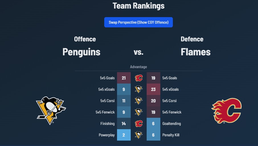 The Pens ran up a 2.75 expected goal total against Calgary on January 10th, yet Cooley only gave up one actual goal and the Flames won a 2-1 game almost entirely due to the strong play of their goalie. The Flames low overall talent level gives them a very narrow path towards winning games, they’re going to need a goalie to steal it for them more often than not. That presents a clear challenge for Pittsburgh in this game: overcome the Flames’ strongest suit in the goalie factor (whether it ends up being Cooley or Wolf) and the rest ought to be right there for the taking. A performance for the Pens similar to the last game against Seattle (where Pittsburgh scored 5 non-empty net goals on 2.88 expected) would be the ideal in this game, as it would in just about any game. Given Calgary’s unimpressive defensive metrics, that should be on the table, though Pittsburgh (at 9th in expected 5v5 goals and just 21st in 5v5 actual goals) will need to execute on their chances in ways they didn’t in the last meeting.
