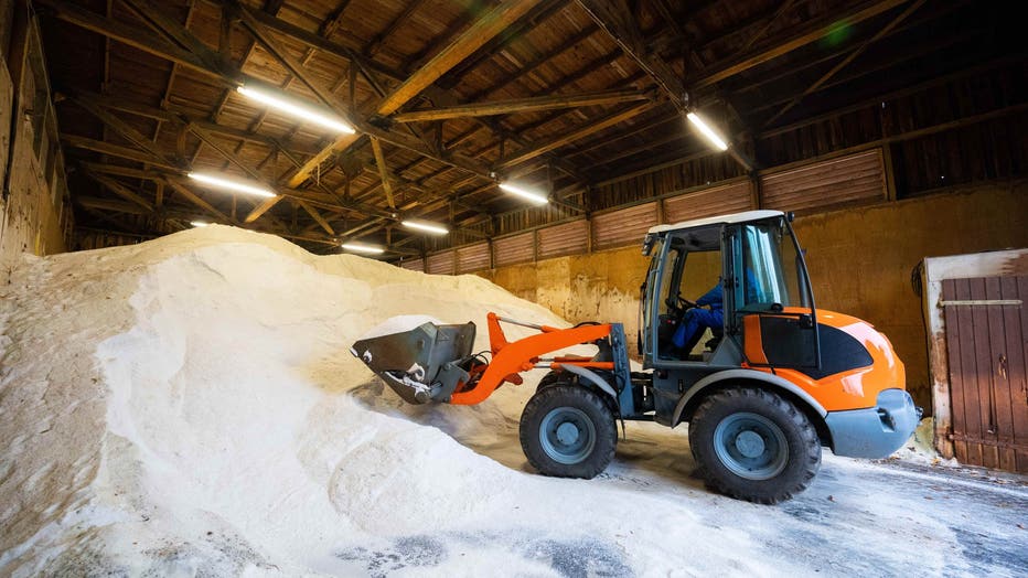 20 November 2024, Lower Saxony, Garbsen: An excavator loads road salt onto its shovel. Photo: Alicia Windzio/dpa (Photo by Alicia Windzio/picture alliance via Getty Images)
