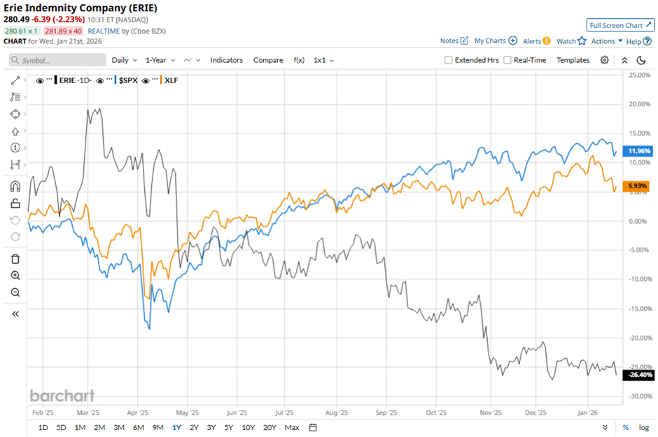 ERIE stock has declined 26% over the past 52 weeks, underperforming the S&P 500 Index’s ($SPX) 13% return and the State Street Financial Select Sector SPDR ETF’s (XLF) 5.8% rise over the same period.
