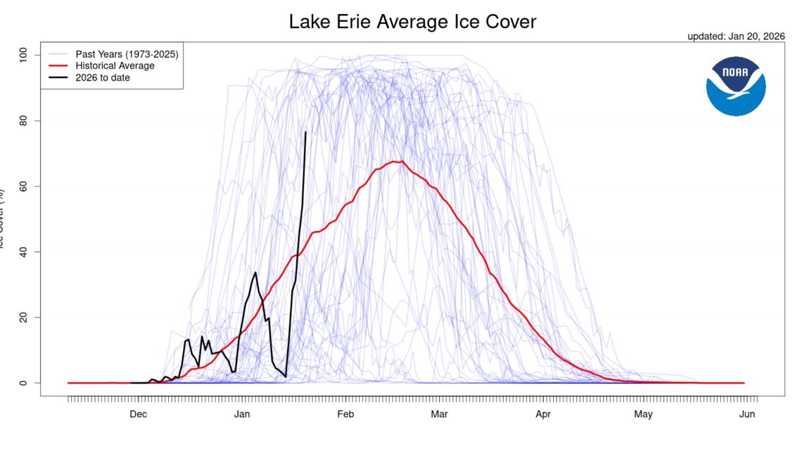 With the Great Lakes shipping season having come to an end, and the seasonal closure of the Soo Locks on Jan. 15, ships were en route to their winter layup locations just as an Arctic front brought bitterly cold temperatures to the region. As of Jan. 20, nearly 80% of Lake Erie was covered in ice, according to NOAA data. This is up from nearly no ice coverage only a few days prior.Â