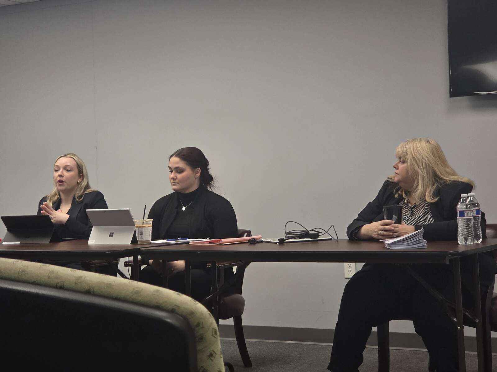 From left, Olivia O’Donnell and Jendi McNicholas, staff attorneys with Neighborhood Legal Services, and Melissa Evans, managing attorney for its Economic Security Unit, speak at a criminal record clearing clinic on Wednesday, Jan. 7, at the Holly Pointe Building in Butler. Eddie Trizzino/Butler Eagle