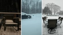 L to R: Credit: Donna Daltry – Deck out back door as of 6 a.m. in Garnet Valley, Pennsylvania, Credit: Greg Fretz – Snowfall so far in Boyertown Pa, Berks County, Credit: Chad Petersen – Back deck in Garnet Valley!