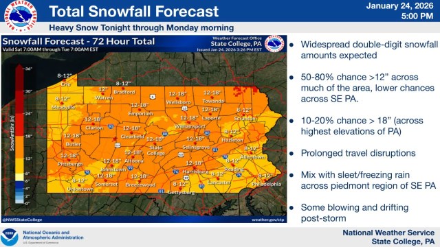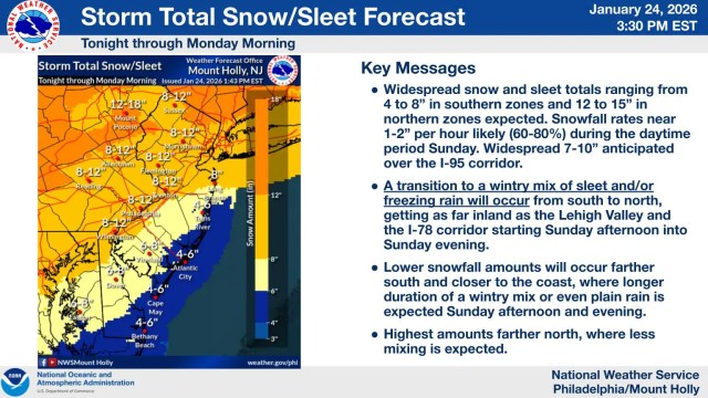 Snow totals in the Poconos range from 12 to 18 inches. However, traffic and driving could become extremely dangerous. “There is high confidence in major impacts from snowfall, sleet, and ice accumulations across much of the area, making travel very difficult, and potentially resulting in widespread closures and infrastructure impacts,” the National Weather Service posted on its website.