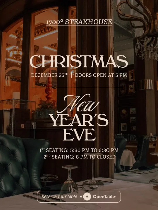 Christmas Day dinner at the award-winning 1700° Steakhouse will be available from 5 to 10 p.m. Enjoy an exquisite beef wellington and other festive items on the menu “ensuring a personalized and memorable Christmas dining experience,” read the release by the hotel.